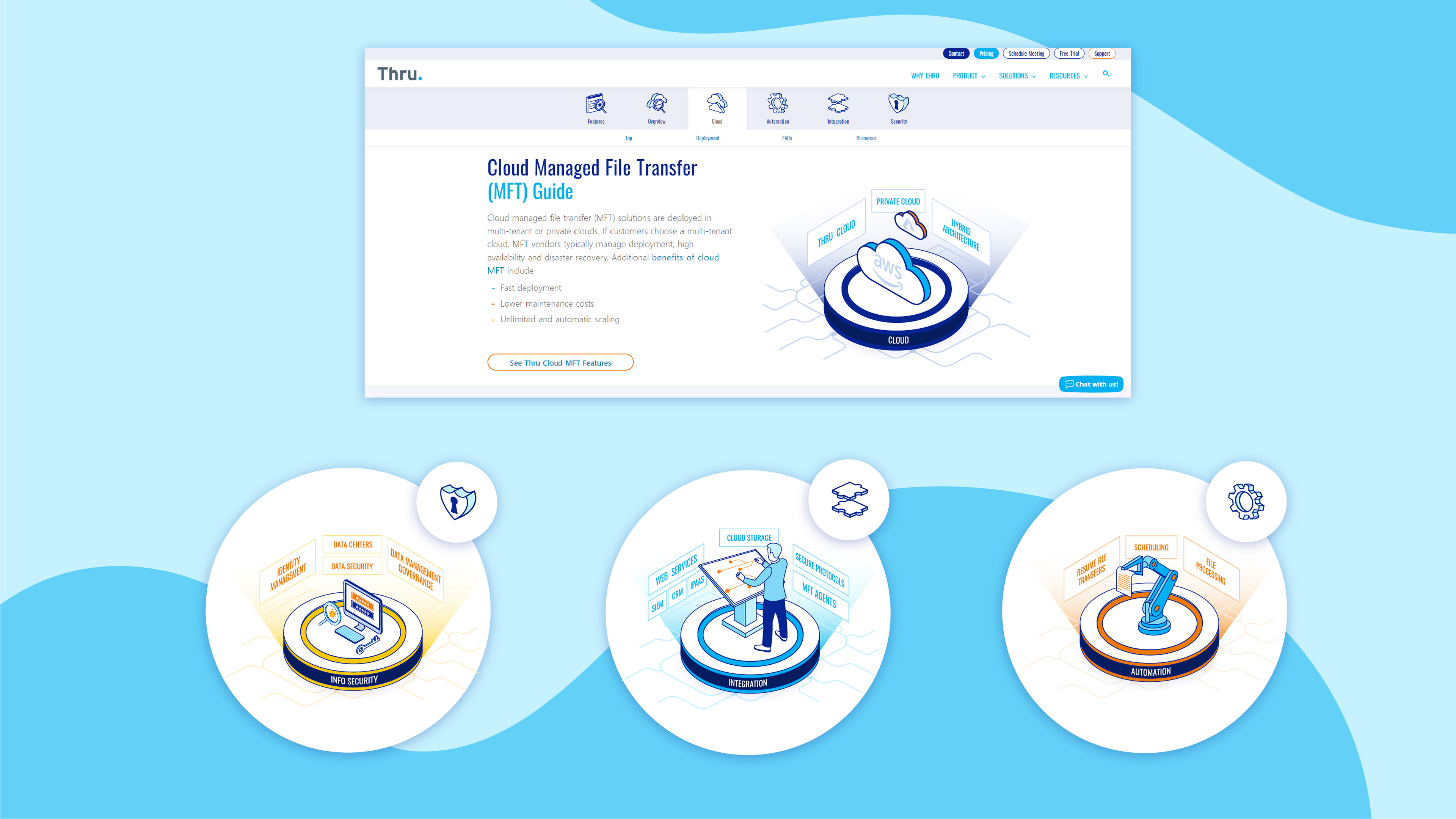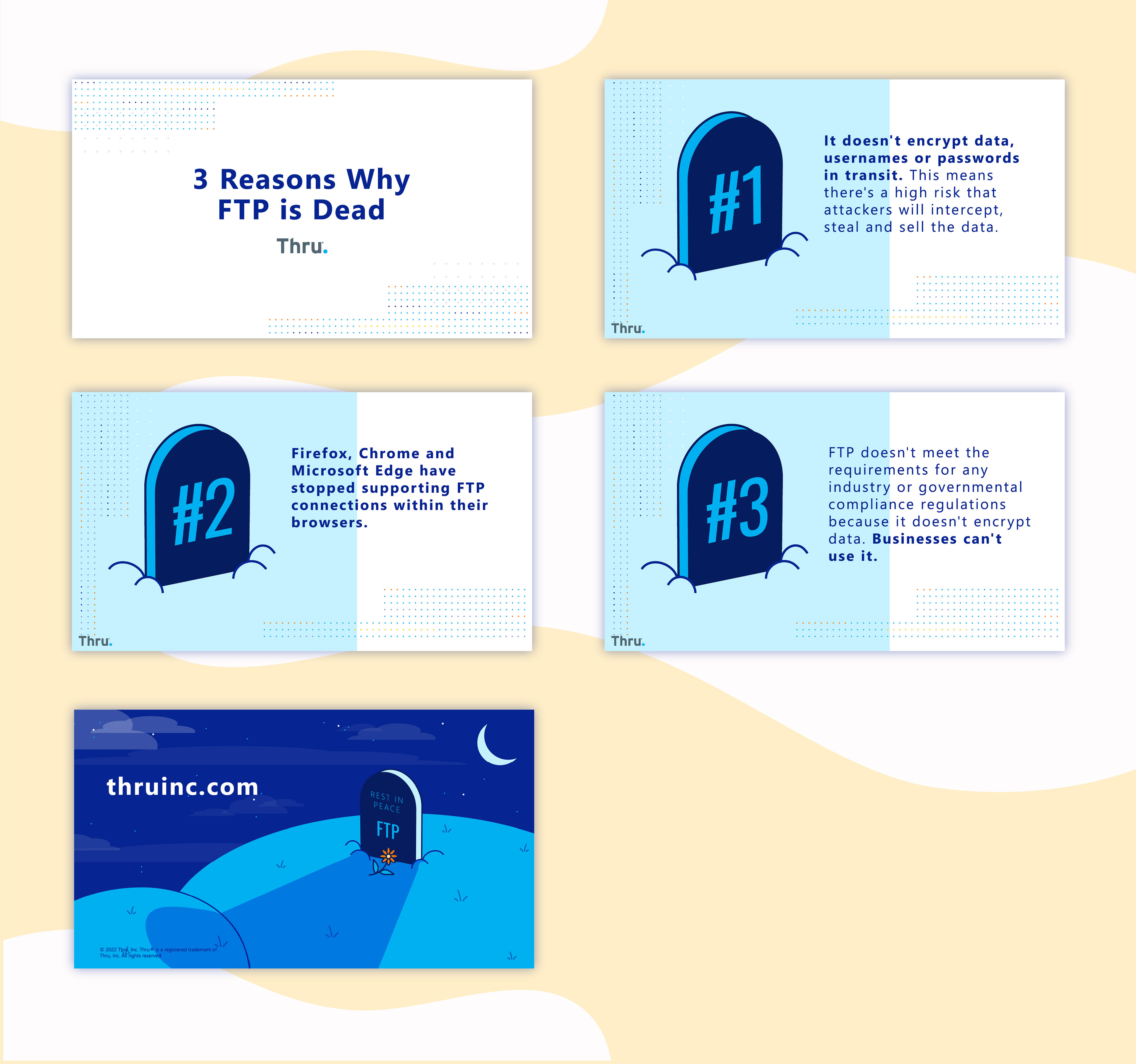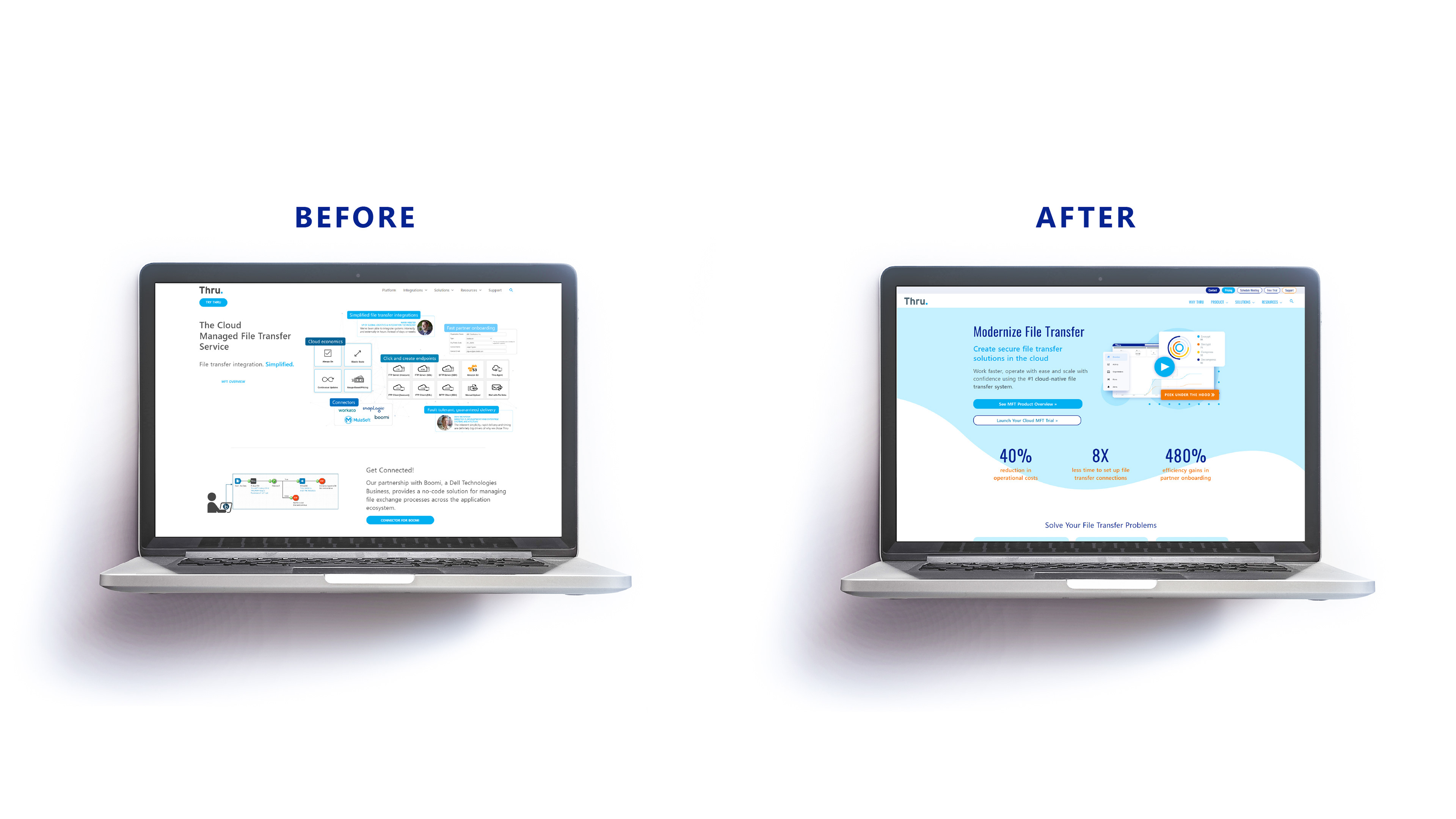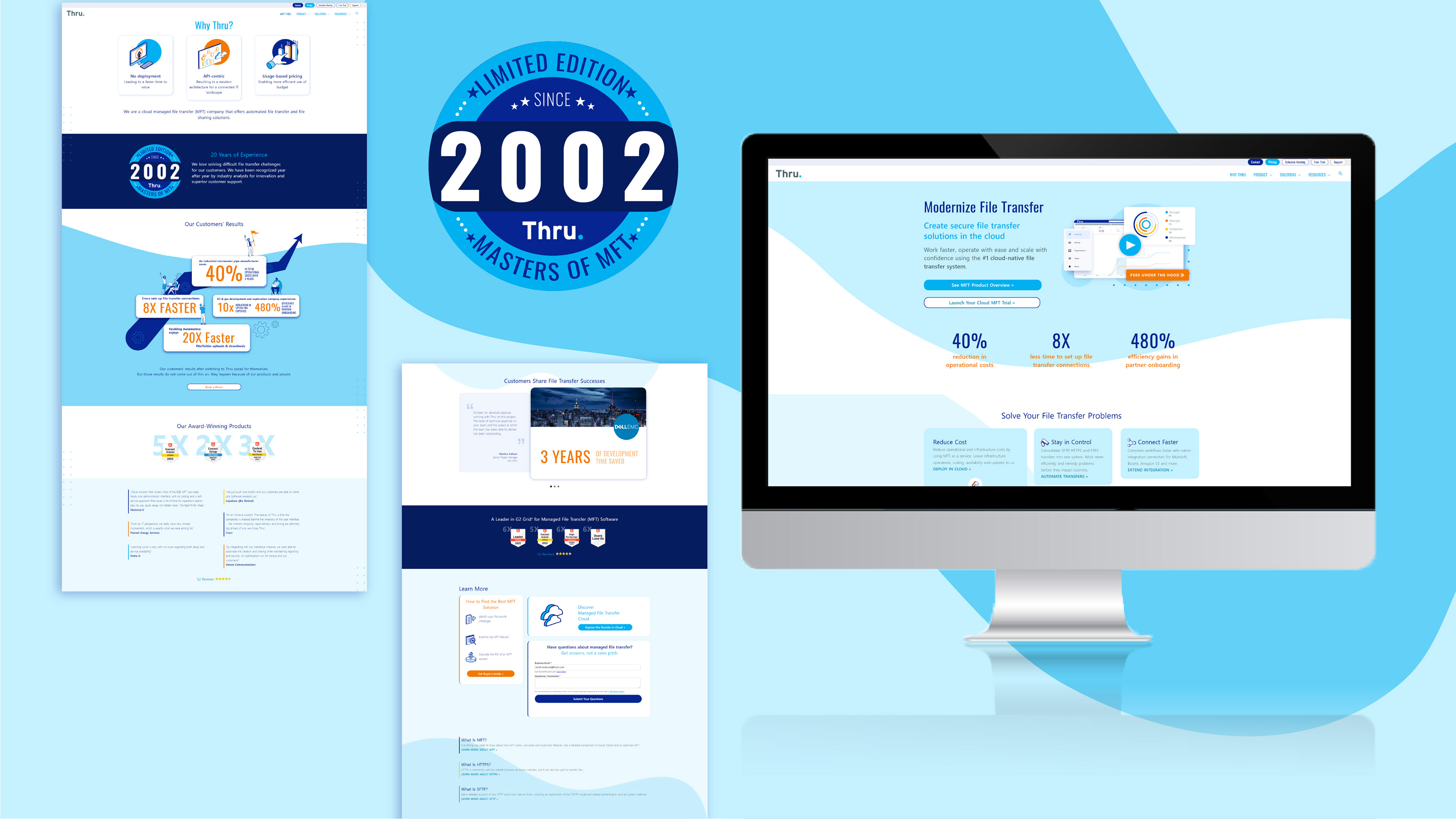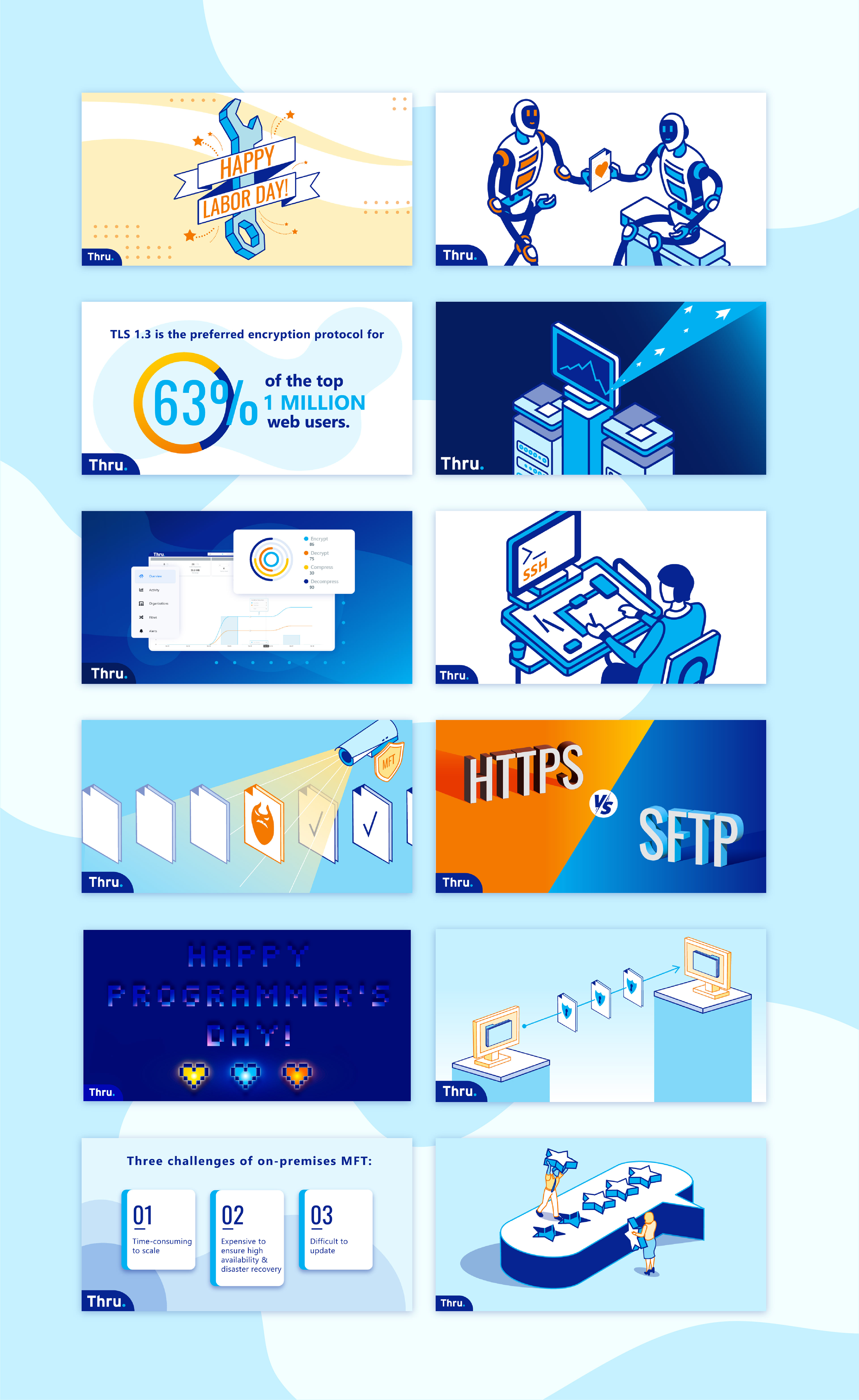 In 2020 Thru Inc, a Managed File Transfer as a Service (MFTaaS) vendor, decided it was time to update their 18 year old brand. My role was to breathe some modernity and color into their core brand goals and help them continue to maintain those qualities throughout their internal and public content.